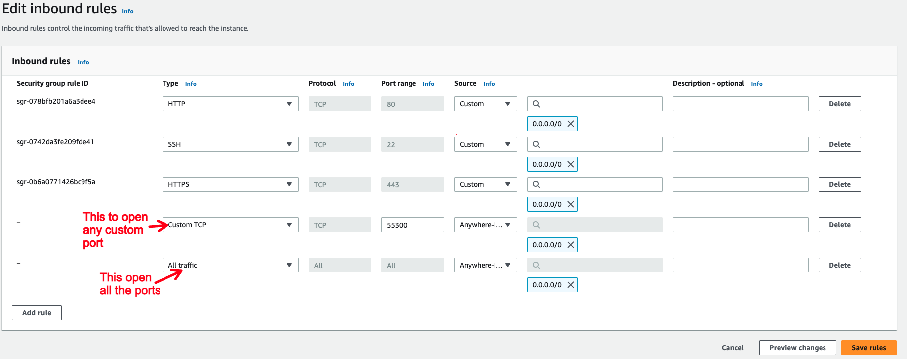 You can also use All traffic to allow all the traffic to instance but it is not recommended.